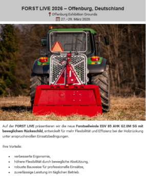 Auf der Forst-Live in Offenburg 2026, präsentieren wir die Fa.Engel Forsttechnik, zusammen mit Tajfun das erste mal, die neue Forstseilwinde Tajfun EGV 85 AHK G2.0M SG mit beweglichem Rückeschild!